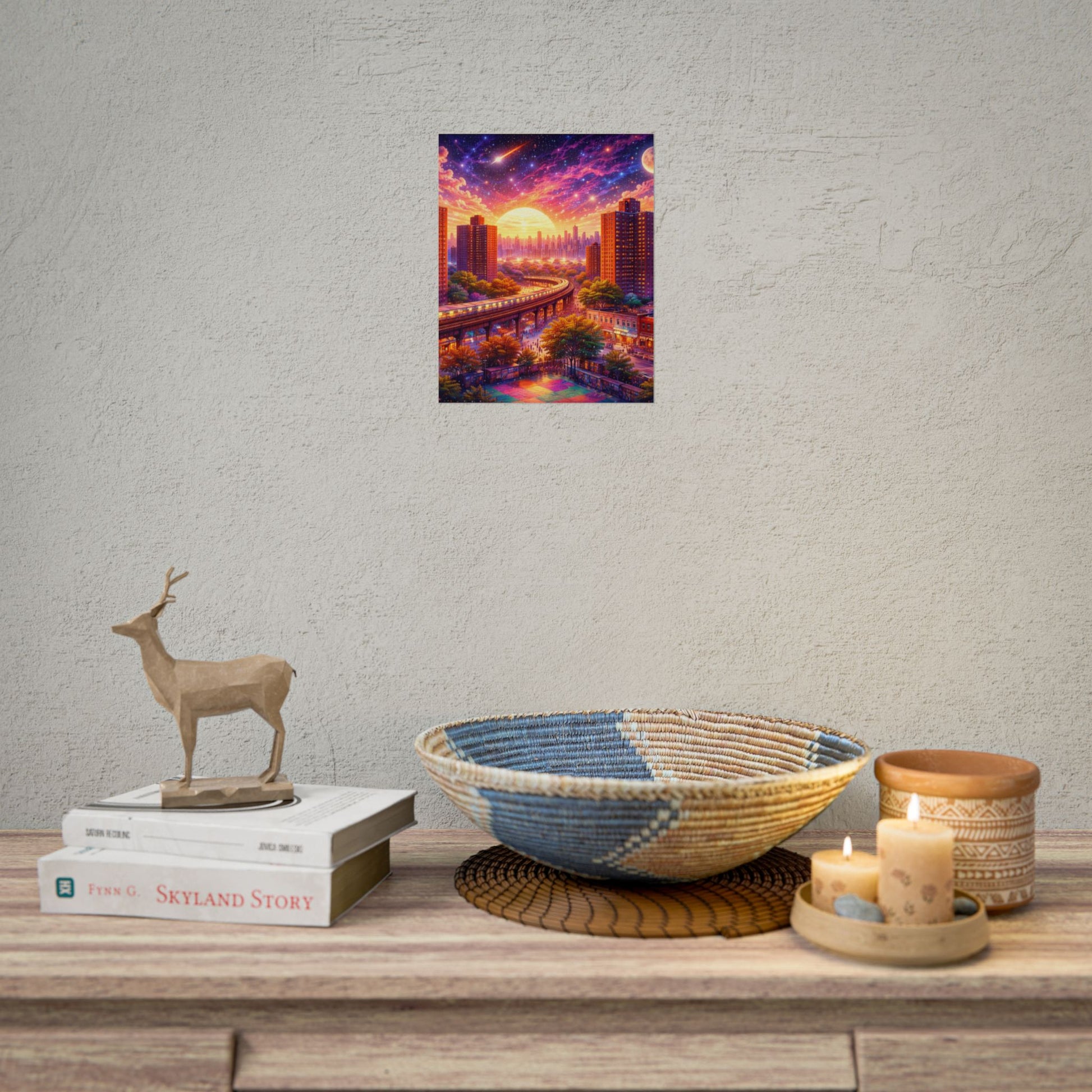 Bathed in sacred neon hues, the skyline pulses with warmth, resilience, and rhythm. The familiar urban landscape transforms into a visionary scene of molten sunsets, electric reflections, and hypnotic motion — a tribute to the soul, culture, and creative force of the Bronx.