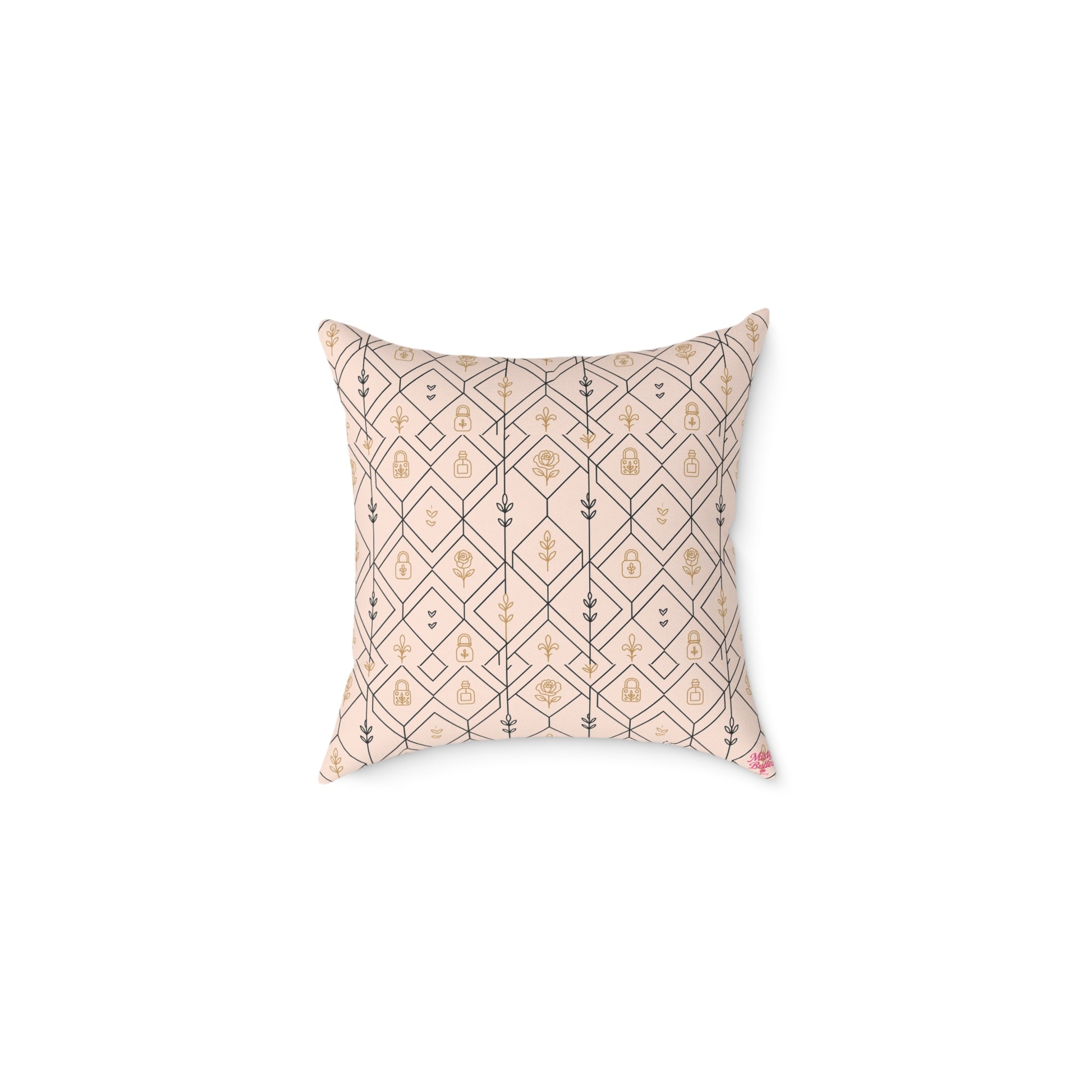 This throw pillow from the Camille Belle Couture Collection captures the quiet luxury of a French penthouse with its soft blush base, clean black geometric lines, and delicate gold motifs inspired by roses, perfume bottles, and classic Parisian ornamentation.