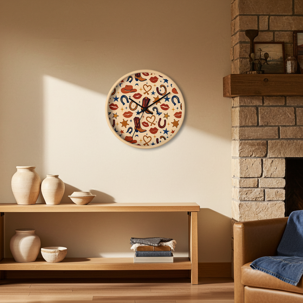 Cowgirl Kiss Wild West Wall Clock – Retro Western Lips, Stars & Boots Pattern