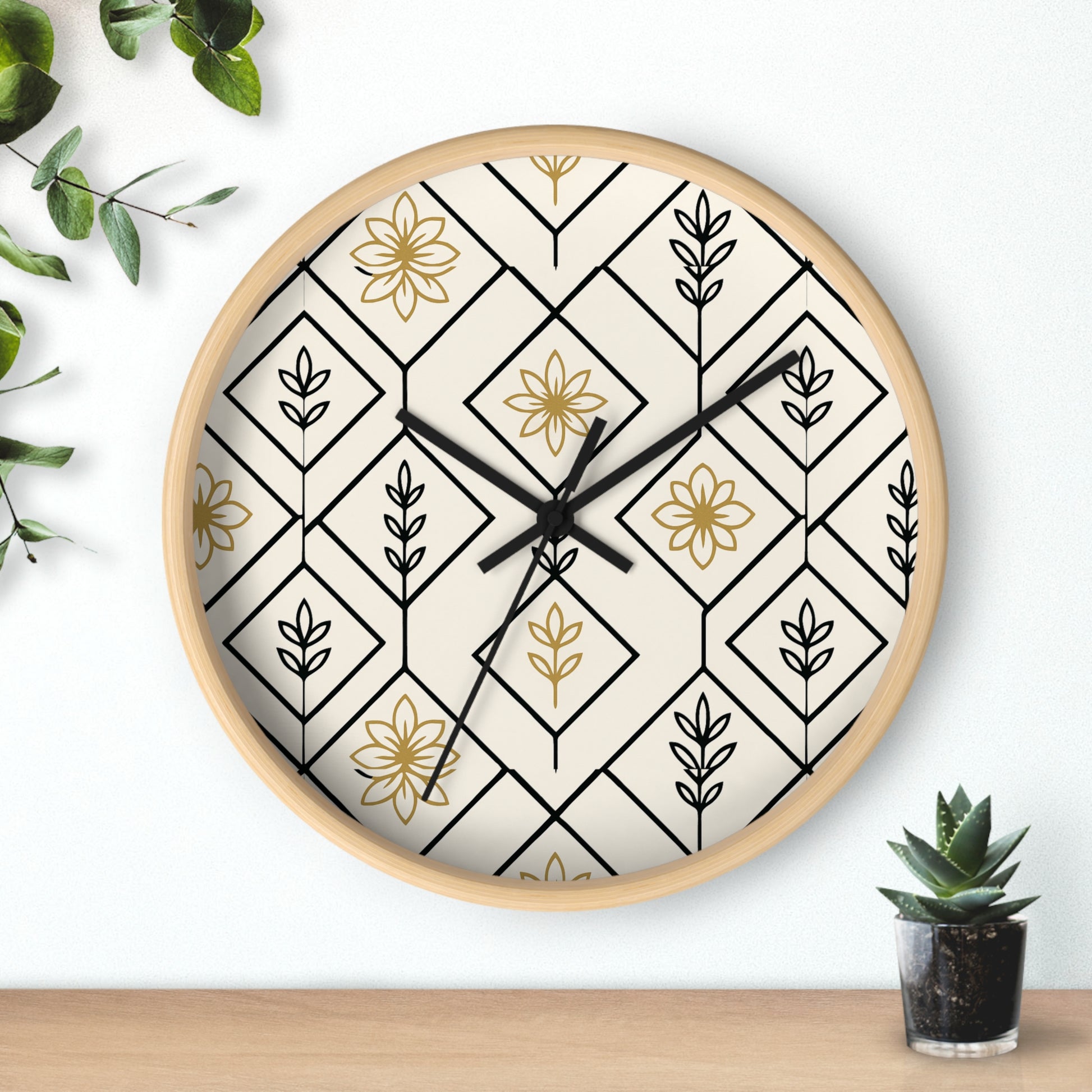 Elegant and chic wall clock featuring a French-inspired geometric floral pattern. Perfect for bedrooms, offices, entryways, and curated living rooms. Adds a touch of quiet sophistication to any space. Relevant for home decor enthusiasts, interior design lovers, and those looking for a stylish timepiece. Ideal for gifting on housewarmings, birthdays, or holidays.