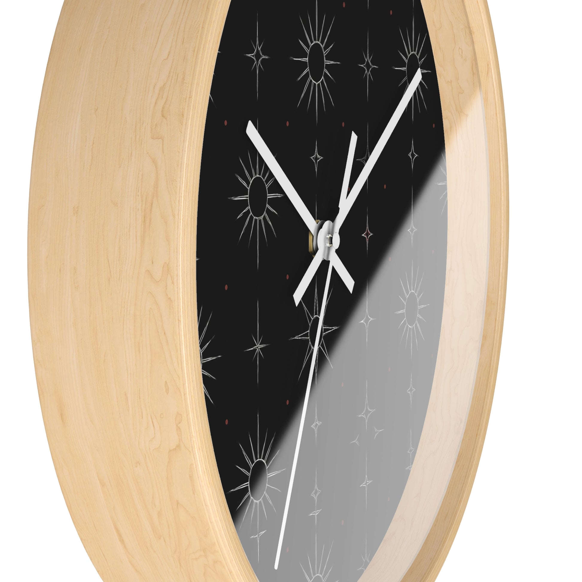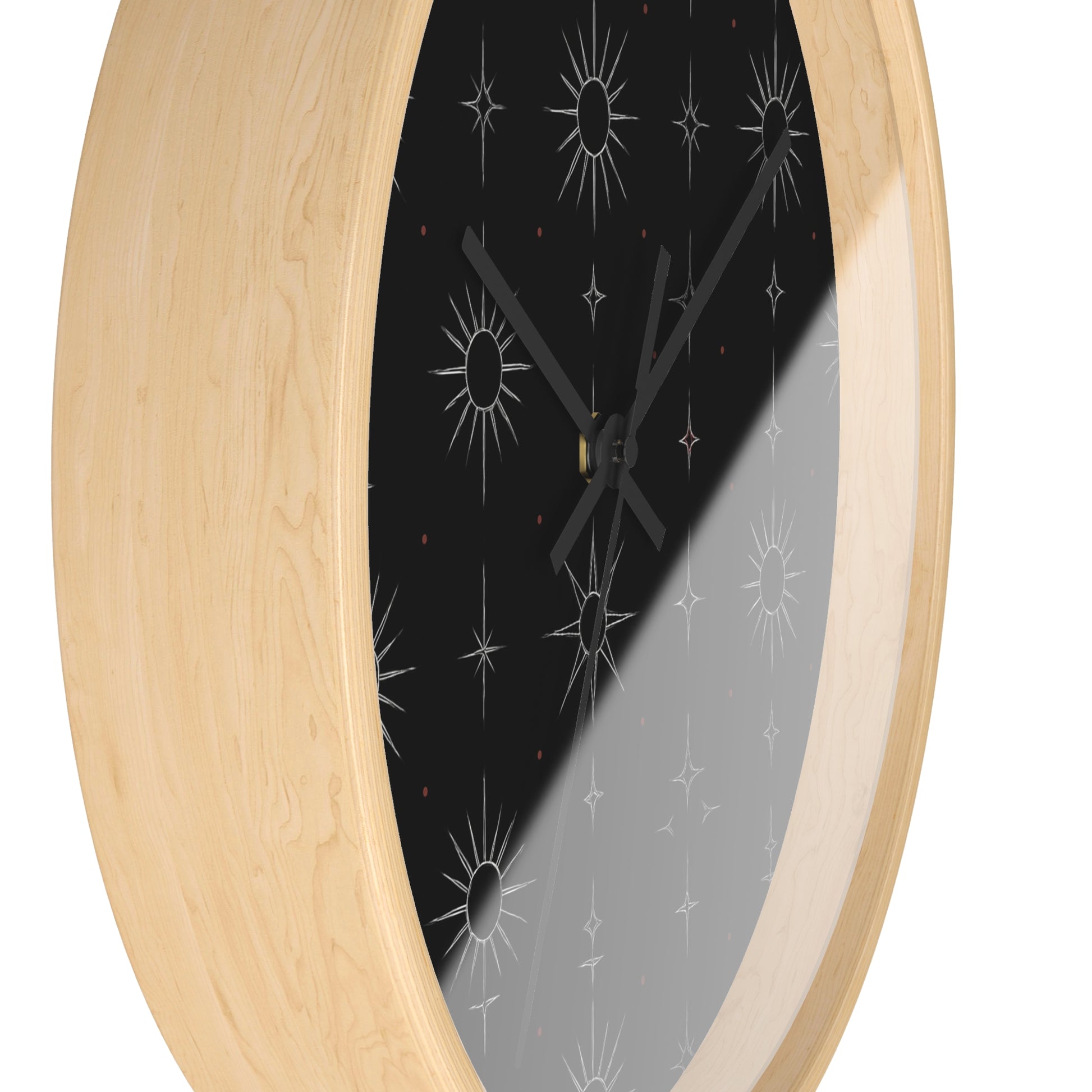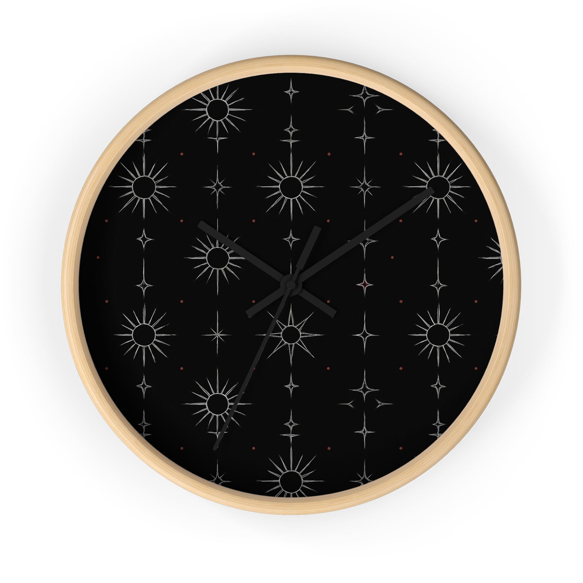 Transform your space with this striking Midnight Starburst Wall Clock, designed with a sleek black backdrop and a repeating pattern of modern starburst silhouettes. The clean silver linework and tiny celestial accents add a contemporary, atmospheric touch that complements minimalist, modern, and cosmic-inspired interiors.