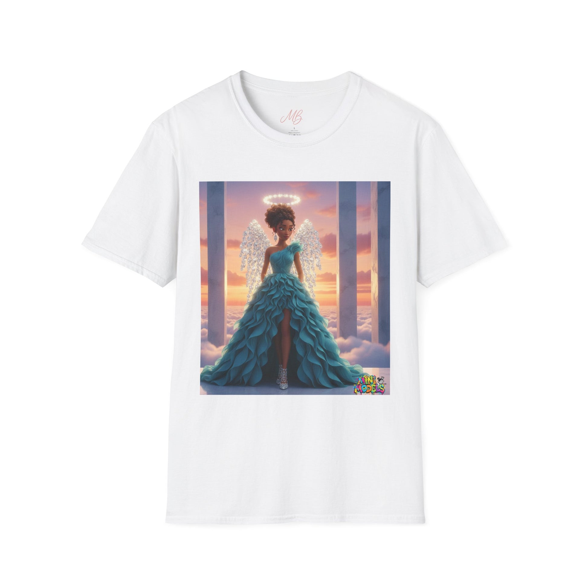 The Haloed Empress Tee features a radiant Mini Model angel standing between glowing columns at sunset — jeweled halo, luminous wings, and a dramatic teal couture gown flowing through the heavens. This isn’t soft angel energy… this is divine authority.