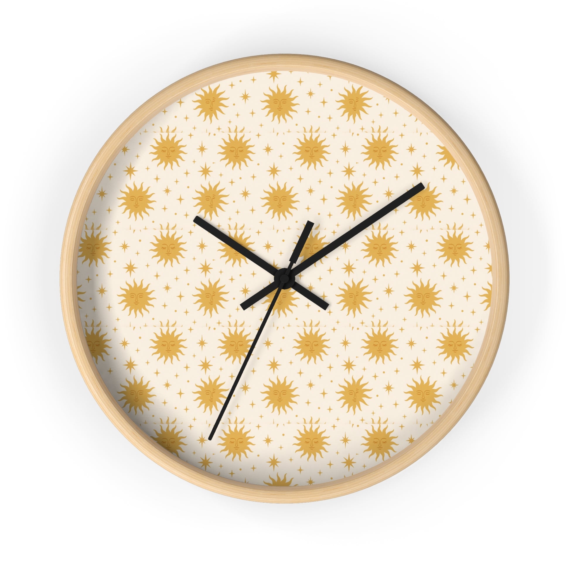 Brighten your space with this elegant Golden Sunburst Wall Clock, featuring a repeating pattern of warm gold suns and tiny star accents on a soft cream background. The design blends modern minimalism with subtle celestial charm, making it a perfect statement piece for any room.