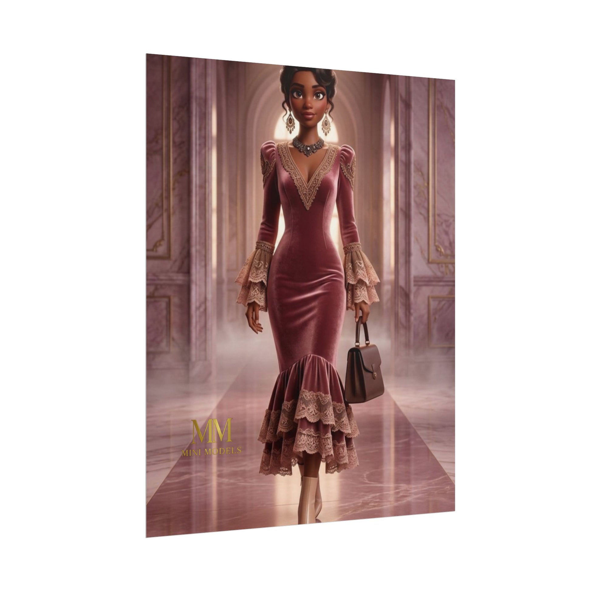 Rose Hall – Blush Velvet is a refined portrait from the Mini Models Estate Series. Draped in sculpted blush velvet with delicate lace detailing, this look captures timeless elegance within grand marble interiors. Structured tailoring meets soft femininity, creating a poised silhouette designed for modern collectors.