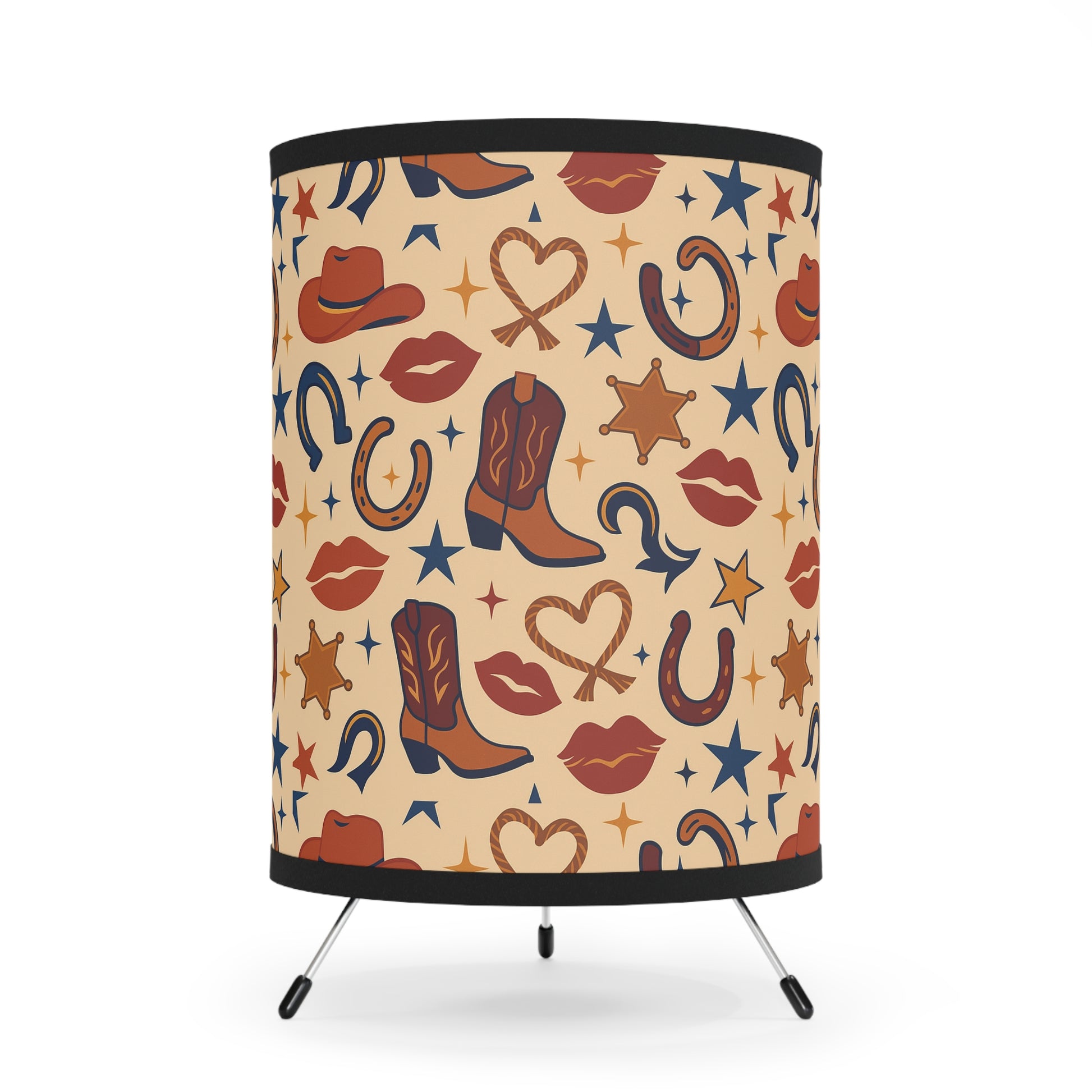 Give your space a kiss of country sass with the Wild West Kisses lamp shade — a vibrant retro cowgirl pattern bursting with playful icons. From bold red lipstick marks and classic cowboy boots to lucky horseshoes and starbursts, this design brings that flirty, free-spirited Western energy into any room.